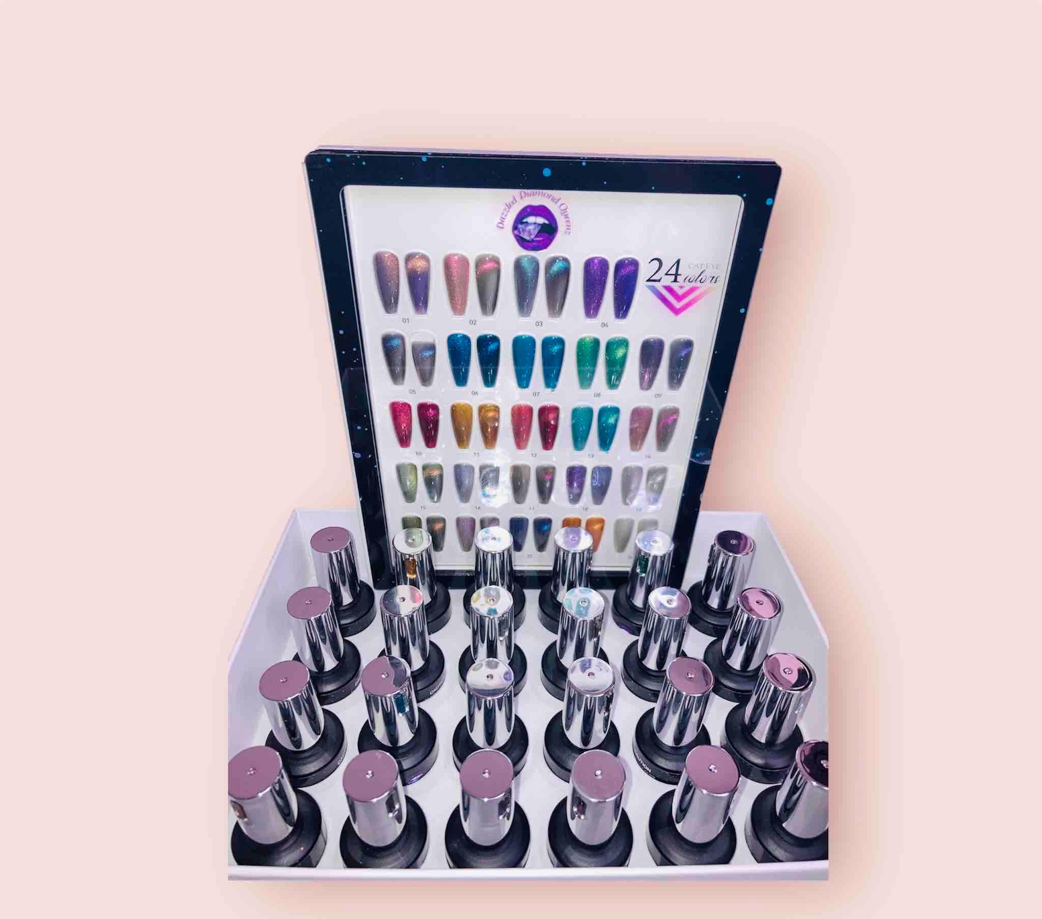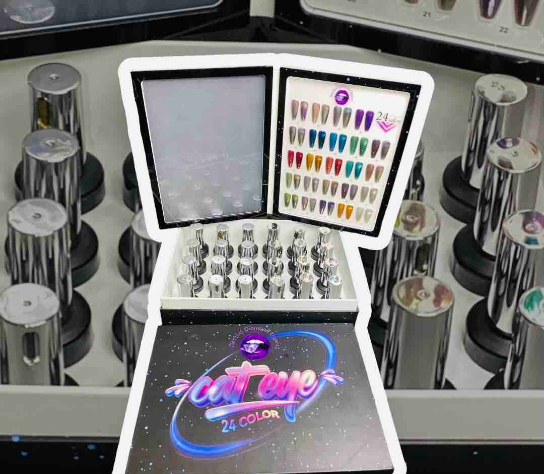 "Unleash the feline flair with our mesmerizing cat eye queen gel polish! This luxurious formula combines rich, bold color with an iridescent sheen, casting a spell of sophistication on your nails. The gel polish ensures long-lasting wear and high shine, while the cat eye effect adds a touch of whimsy and glamour. Perfect for adding a little pizzazz to your everyday look or making a statement at your next night out. Purr-fectly polished, every time!" (24 15ml set )